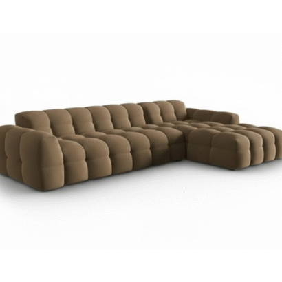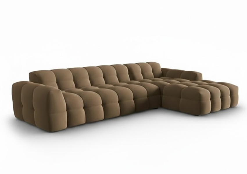 A modern L-shaped modular sofa with plush tufted cushioning, designed for ultimate comfort and contemporary living. Customisable in size and fabric, this sofa blends luxury, durability, and everyday relaxation effortlessly.