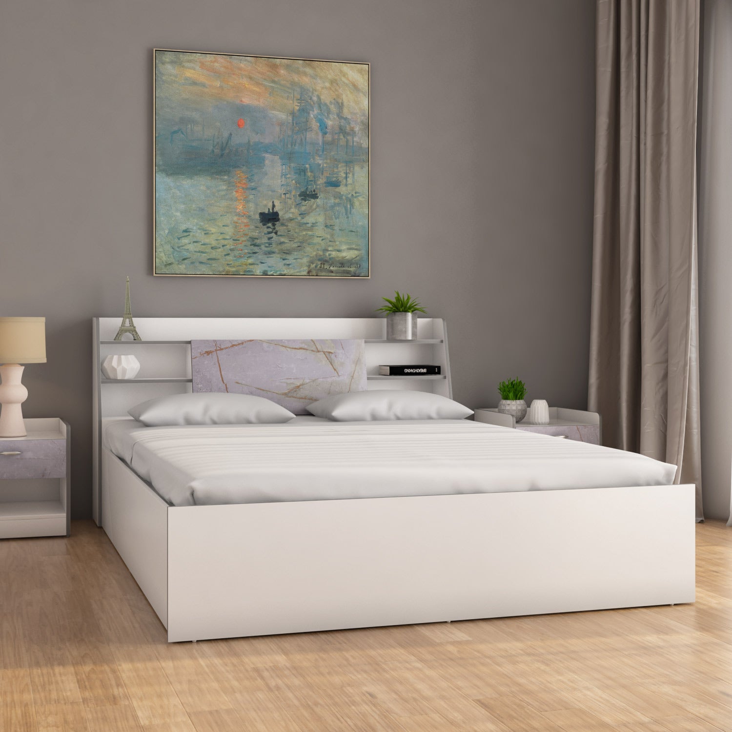The Nilkamal Marbito Queen Bed is a true embodiment of timeless elegance and meticulous craftsmanship. Constructed with Engineered wood, this bed assures enduring reliability, standing the test of time. Its thoughtfully designed storage solution with four spacious compartments and headboard shelves offers efficient organization for your essentials. The accent marble ply in the headboard centre elevates the overall aesthetic, infusing glamour into your bedroom decor. Enhanced with a resistive melamine finish, it increases longevity and simplifies maintenance. The bed’s pristine white colour adds an air of neutrality to your bedroom decor, granting you the creative freedom to curate a serene space that reflects your unique style.