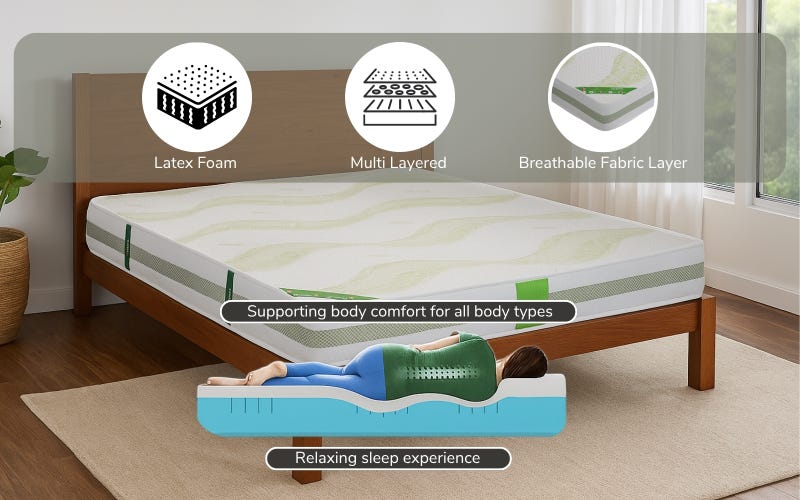 Indulge in the ultimate sleeping experience with the Royaloak American Luxury Ortho Latex Queen Mattress, designed to combine comfort, durability, and advanced support. Crafted with an 8-inch thickness, it features a breathable 450 GSM knitted bamboo fabric for a cool and fresh surface. The mattress includes 1 inch of natural latex for eco-friendly resilience, 1 inch of super soft foam for plush comfort, and 3 inches of HR foam ensuring superior structure. For firm orthopedic support, it incorporates 3 inches of high-density rebonded foam, balanced with a strong knitted jacquard fabric base. Engineered for long-lasting use, this mattress delivers optimal spine alignment, pressure relief, and a luxurious sleep environment, making it a perfect blend of innovation and indulgence.