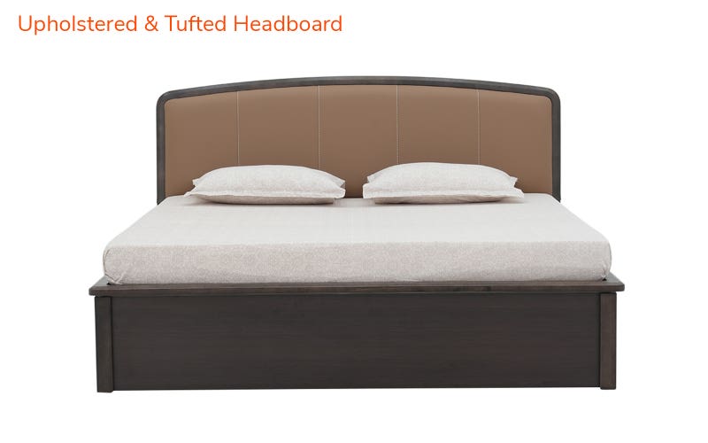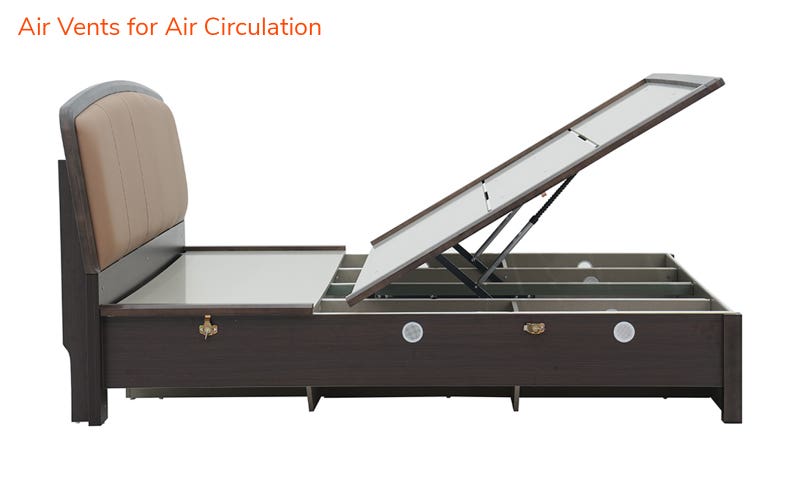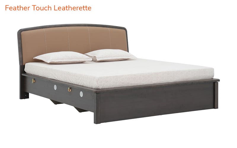 Transform your bedroom into a haven of luxury with the Royaloak Dallas American King Bed with Upholstered Headboard & Hydraulic Storage. Made with High-Density Fiberboard (HDF) and covered with Melamine, this king bed with hydraulic storage is durable and resistant to scratches and moisture. The solid wood headboard frame and side beedings provide sturdy support and sophistication, while the upholstered and tufted headboard offers a luxurious, plush backrest. Finished with feather touch leatherette, the king bed is sophisticated and low maintenance. The feather touch leatherette king bed has a hydraulic lift-up storage system that is conveniently accessible, and there are air vents that provide maximum airflow. Its good ground clearance allows for ease of maintenance. The king size bed is designed for modern living, and its practicality is complemented by good looks.
