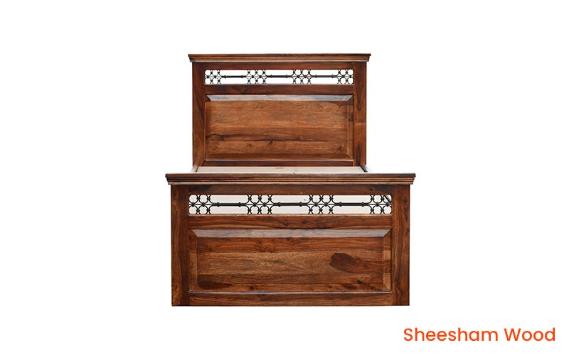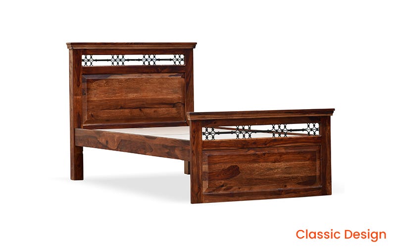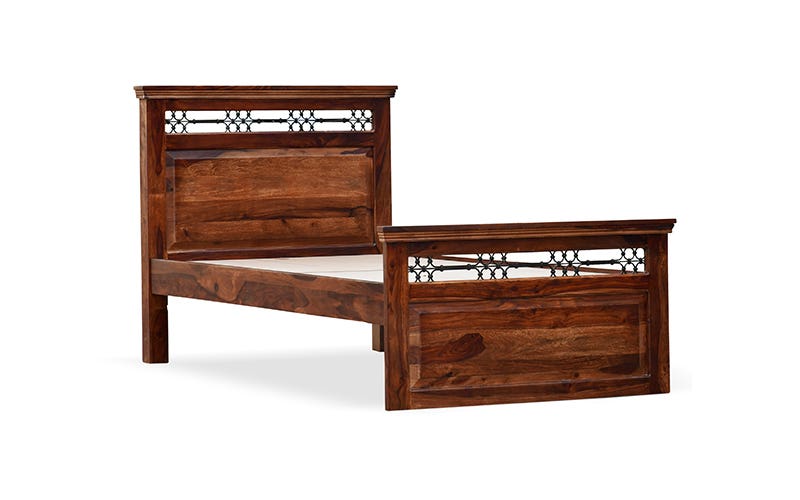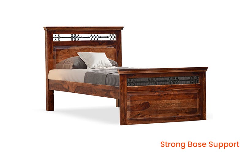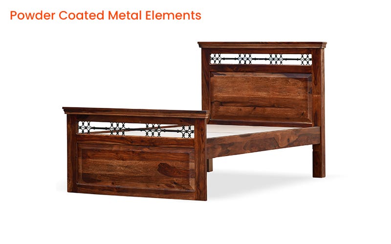 Royaloak Hilton Wooden Single Bed is a timeless piece that exudes traditional elegance. Crafted from premium Sheesham wood, this bed showcases bevelled profiles and a classic style of woodworking. Its sturdy construction, featuring thick posters and strong base support, ensures durability and stability. The bed’s headboard & footboard are adorned with exquisite powder-coated metal jaali work, adding a touch of sophistication. Immerse yourself in the warmth and charm of this solid wood bed, a perfect addition to any bedroom seeking a touch of classic luxury. Buy designer single bed or single cot from Royaloak India’s No.1 furniture brand now & enjoy the benefits of owning international furniture & décor at unbeatable prices. Live like a king or a queen, and discover the charm of regal living with Royaloak’s Emperor collection. Inspired by the grand interiors of Indian palaces, this vintage collection is exclusively curated for those who settle for nothing less. Crafted to perfection using solid wood, these fine pieces of furniture will last for generations.