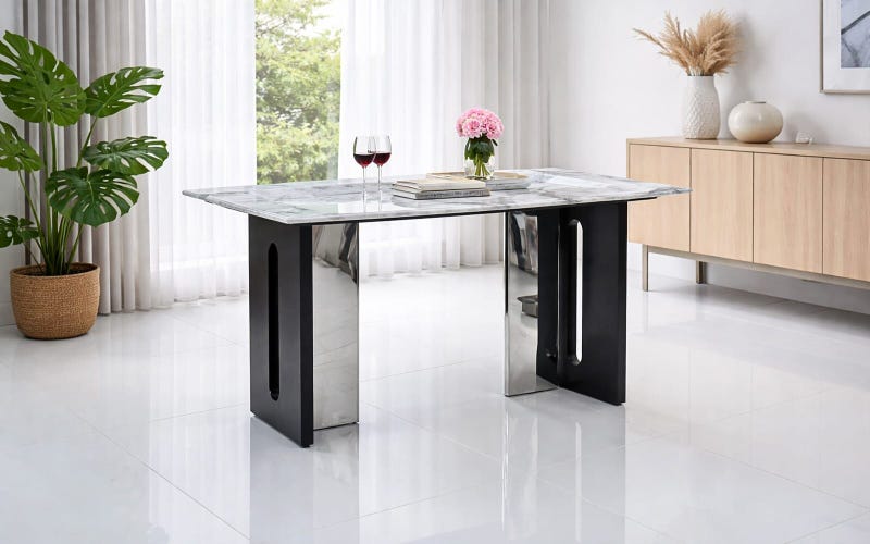 Transform your dining space with the Royaloak Seattle American 5D Natural Stone Dining Table Four Seater, a perfect combination of luxury and functionality. Featuring a stunning 5D printed natural stone top, this four-seater dining table offers both durability and a sophisticated design. The sculptural chrome legs add a modern touch, elevating your dining room decor. Designed to be stain-proof and non-porous, this 4-seater dining table is both easy to maintain and highly durable. Whether you’re hosting a family dinner or enjoying a quiet meal, this ensures high stability and contemporary elegance. Perfect for any home or dining room, this rectangular dining table is the ultimate choice for those looking to add a stylish and practical centerpiece to their space.