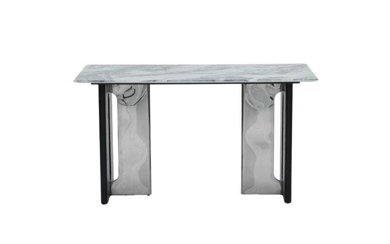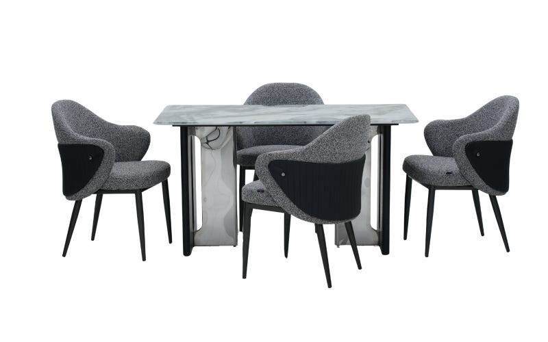 Bring home a thoughtfully designed Royaloak Seattle 5D Natural Stone Dining Table & Seattle Dining Chair Four Seater Set that blends elegant design with everyday functionality. This exquisite set combines elegance and functionality, featuring a luxurious 5D printed natural stone tabletop supported by striking chrome element legs. This four-seater rectangular dining table’s sculptural base and contemporary design add a touch of modern sophistication to your home. Paired with premium dual-fabric upholstered chairs, each with black nickel accents and a curved back design, this 4-seater dining table set for home ensures both comfort and style. Perfect for long dinners, the chairs offer extra cushioning for superior comfort, while the sturdy metal legs and durable frame promise lasting quality. Whether you’re hosting dinner parties or enjoying family meals, this latest four-seater dining table set brings both beauty and practicality to your dining room. Ideal for anyone looking to buy an online dining table four seater set.